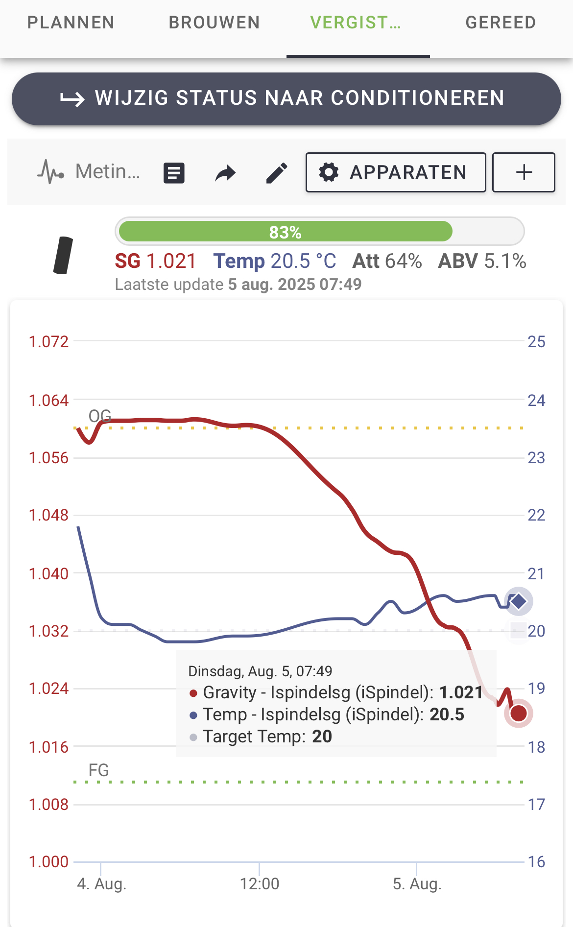 Afkoelen met 5 Liter koud kraanwater naar 20°C, gist erbij, en weggezet voor vergisting. Niet in een donkere kelder, maar in een omgebouwde koelkast als vergistkast.